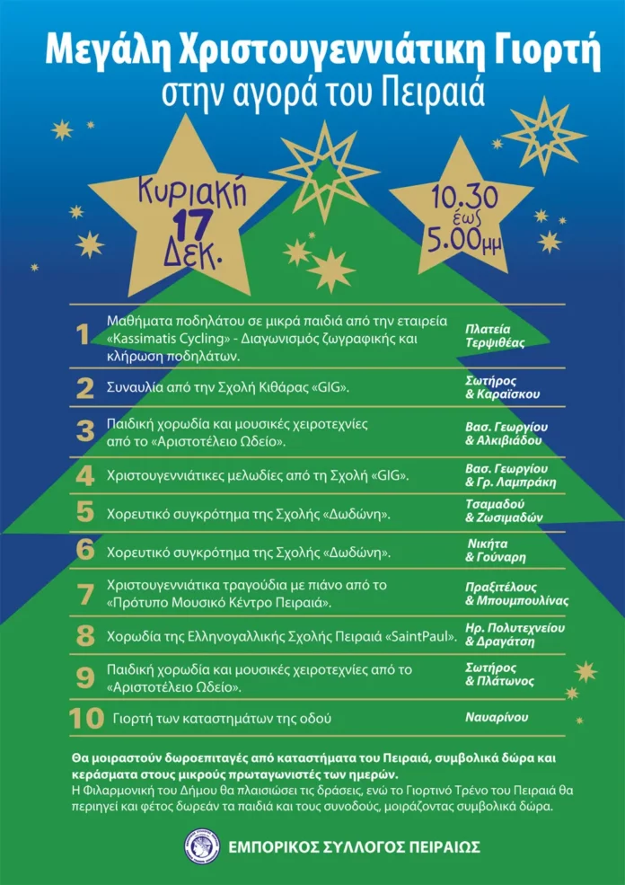 Την Κυριακή 17 Δεκεμβρίου από τις 10.30 έως τις 5.00 μ.μ. διοργανώνουμε, με τη στήριξη και του Δήμου Πειραιά, την μεγάλη Χριστουγεννιάτικη Γιορτή της Πειραϊκής Αγοράς, που περιλαμβάνει τις ακόλουθες δράσεις:
