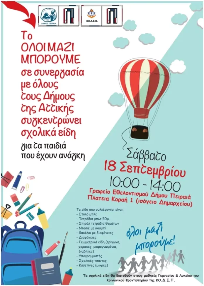 Για δεύτερη συνεχόμενη χρονιά ο Δήμος Πειραιά και η ΚΟ.Δ.Ε.Π. συγκεντρώνουν σχολικά είδη για μαθητές που έχουν ανάγκη, συμμετέχοντας στην καθιερωμένη κοινωνική δράση του «ΟΛΟΙ ΜΑΖΙ ΜΠΟΡΟΥΜΕ», μαζί με όλους τους Δήμους της Αττικής.